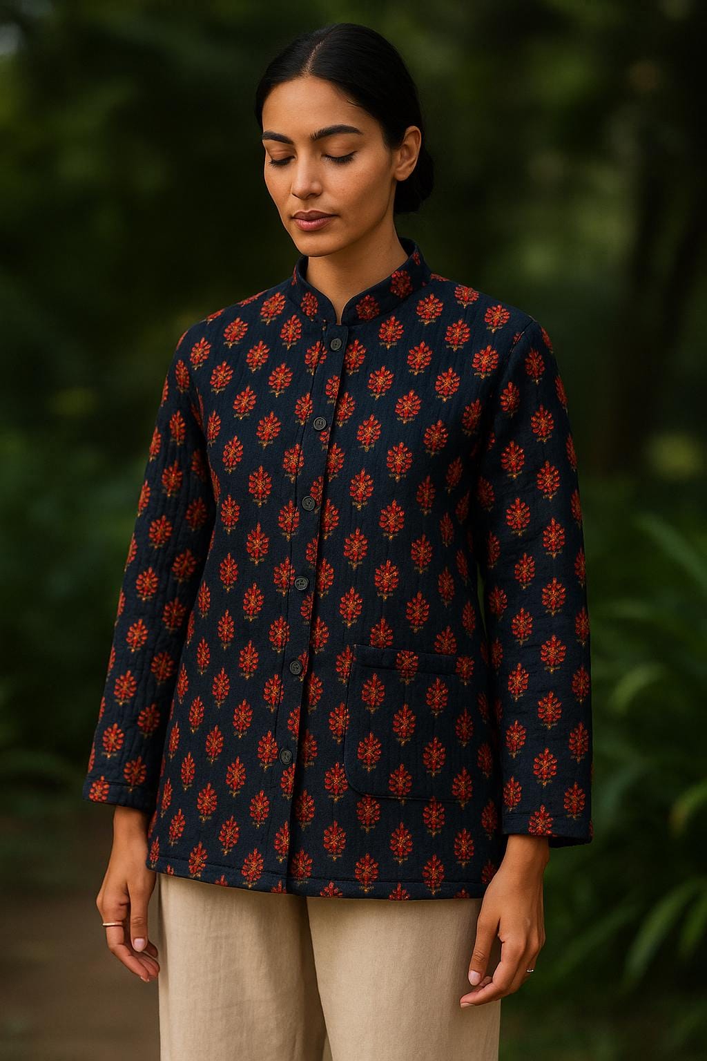 This stunning handmade quilted cotton jacket brings together traditional Indian craftsmanship and modern style. Featuring bold block-printed florals in vibrant red-orange on deep indigo blue, it's the perfect blend of artisan beauty and everyday comfort.